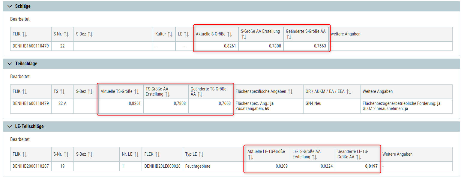 In der Zusammenfassung und im Datenbegleitschein werden bei bearbeiteten Flächen - Schlag, Teilschlag und LE-Teilschlag - die Größe der Flächen in drei Kategorien, einmal die aktuelle Fläche des Antrags (Aktuelle S-Größe, Aktuelle TS-Größe, Aktuelle LE-TS-Größe), die Größe vor dem Anlegen des Änderungsantrags (S-Größe ÄA Erstellung, TS-Größe ÄA Erstellung, LE-TS-Größe ÄA Erstellung) und die Größe nach der Änderung (Geänderte S-Größe ÄA, Geänderte TS-Größe ÄA, Geänderte LE-TS-Größe ÄA) angezeigt.
