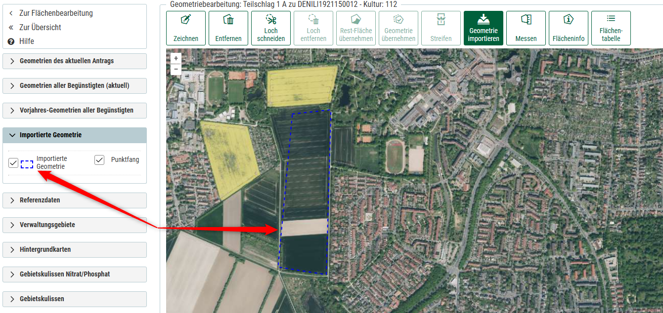 Nachdem Sie auf den Button geklickt haben erscheint eine Möglichkeit die Datei auszuwählen und hochzuladen bzw. zu importieren. Sobald die Geometrie erfolgreich importiert ist, erscheint eine Erfolgsmeldung und in der linken Navigation erscheint ein weiterer Layer "Importierte Geometrien". Ist das Ankreuzfeld gesetzt, kann hierüber die importierte Fläche(n) anzeigen werden. Diese Flächen wird blau gestrichelt dargestellt.