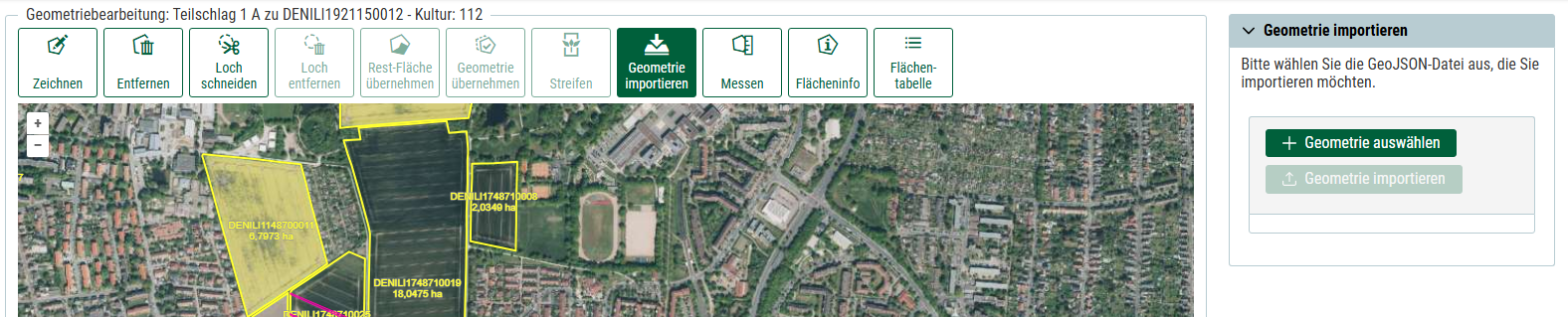 In der Geometriebearbeitung wird ein neuer Button oberhalb der Karte angezeigt: "Geometrie importieren". Hier haben Sie die Möglichkeit Geometrien im Dateiformat geoJSON- zu importieren. Damit können Sie Ihre Flächen auf dieser Basis erfassen.