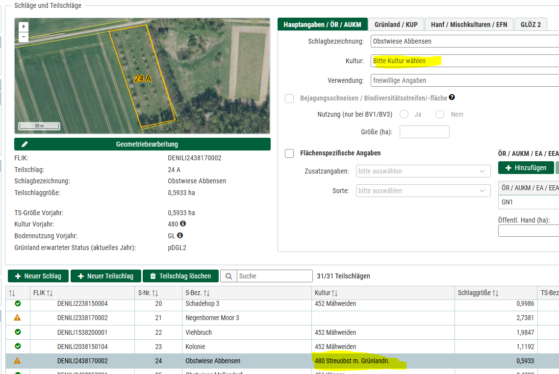 Alternativ kann der Schlag auch gelöscht und neu angelegt werden, um einen passenden Kulturcode angeben zu können. Bitte legen Sie auch dazu den oben genannten Grünlandfehler an.