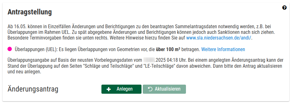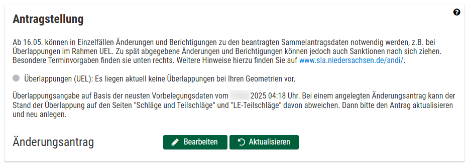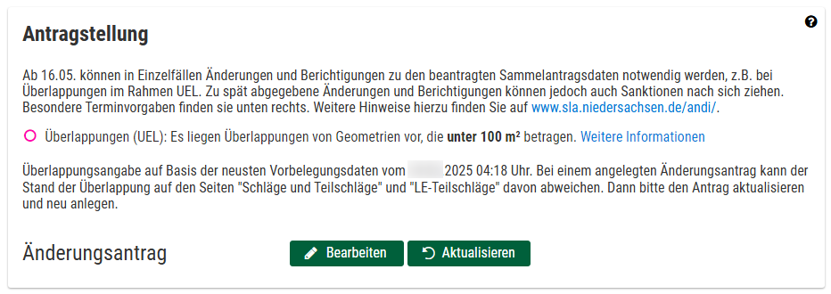 Wichtiger Hinweis zur Aktualität des Datenbestandes: Sobald ein Antrag in ANDI den Status „Bearbeiten“ besitzt (z. B. weil Sie als Anwender in Ihren Antragsdaten etwas überprüfen und den Antrag aufrufen, ohne dass ein Upload erfolgte), könnte es sein, dass nicht der aktuellste Datenbestand in ANDI vorliegt. Dies betrifft vor allem den aktuellen Datenbestand der Überlappungen, welcher täglich neu berechnet wird.