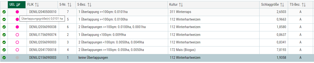 Sofern Sie die Überlappungsgeometrien korrigieren möchte, können Sie sich die betroffenen Schläge in der Flächenübersicht ansehen. Überlappungsflächen haben ein farbliches Symbol in der Spalte UEL. Sofern sich der Mauszeiger auf dieses Symbol befindet, werden die Überlappungsgrößen des TS/TS-LE angezeigt. Sollten an einem TS/TS-LE mehrere Überlappungen vorhanden sein, werden auch mehrere Werte absteigend nach Überlappungsgröße angezeigt.