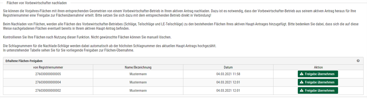 Sie können die Vorjahresflächen mit ihren entsprechenden Geometrien von einem Vorbewirtschafterbetrieb in Ihren aktiven Antrag nachladen. Dazu ist es notwendig, dass der Vorbewirtschafterbetrieb aus seinem aktiven Antrag heraus für Ihre Registriernummer eine 'Freigabe zur Flächenübernahme' erteilt. Bitte setzen Sie sich dazu mit dem entsprechenden Betrieb direkt in Verbindung!