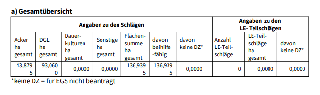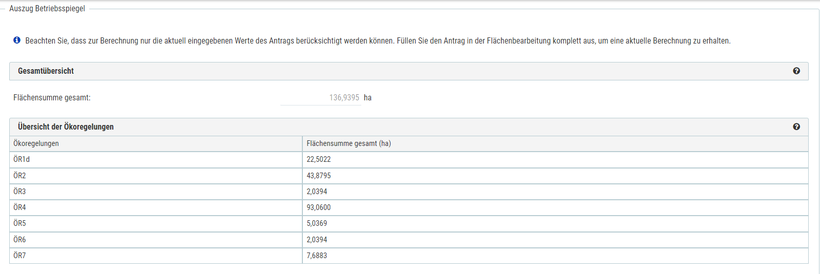 Beachten Sie, dass zur Berechnung nur die aktuell eingegebenen Werte des Antrags berücksichtigt werden können. Füllen Sie den Antrag in der Flächenbearbeitung komplett aus, um eine aktuelle Berechnung zu erhalten.