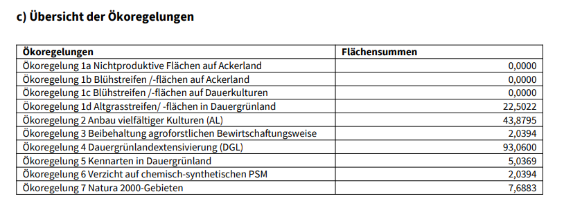 Die Berechnungen der Gesamtübersicht und die Übersicht der Ökoregelungen aus dem Betriebsspiegel können vorab unter dem Menüpunkt "Auszug Betriebsspiegel" eingesehen werden ohne den Betriebsspiegel als PDF zu erstellen oder den Antrag abgeben zu müssen. In Abhängigkeit der Angaben an Ihren Flächen werden diese Berechnungen dann hier angezeigt. Wenn Sie eine relevante Änderung an Ihren Flächen vornehmen, wird auch hier die Berechnung nach dem Aufruf der Seite auf die Änderung angepasst.