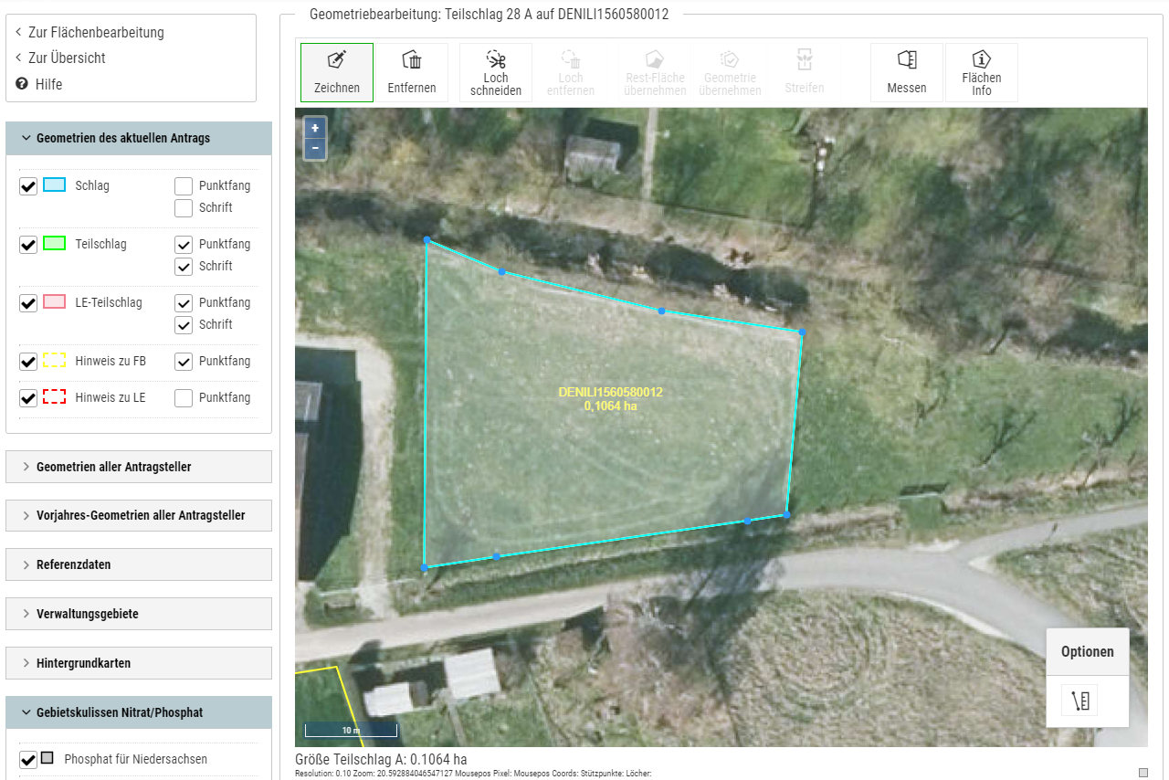 Die Gebietskulisse der nitrat- und phosphatsensiblen Gebiete (rote Gebiete) in Niedersachsen bzw. Bremen werden in der Geometriebearbeitung grundsätzlich eingeblendet und können nur individuell ausgeblendet werden.