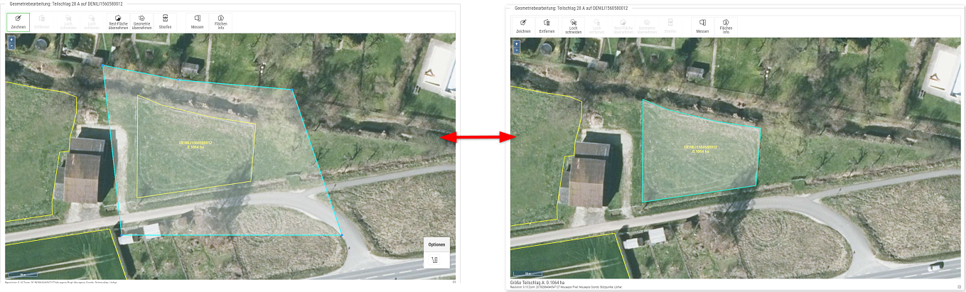 Diese Funktion kann genutzt werden, um ein Loch innerhalb einer bestehenden Geometrie zu zeichnen oder am Rand einer Geometrie auszustanzen. Sehr hilfreich, wenn Teilbereiche in dem Schlag nicht bewirtschaftet werden oder in diesem Bereich ein weiterer Teilschlag mit einer anderen Nutzung eingezeichnet werden soll.