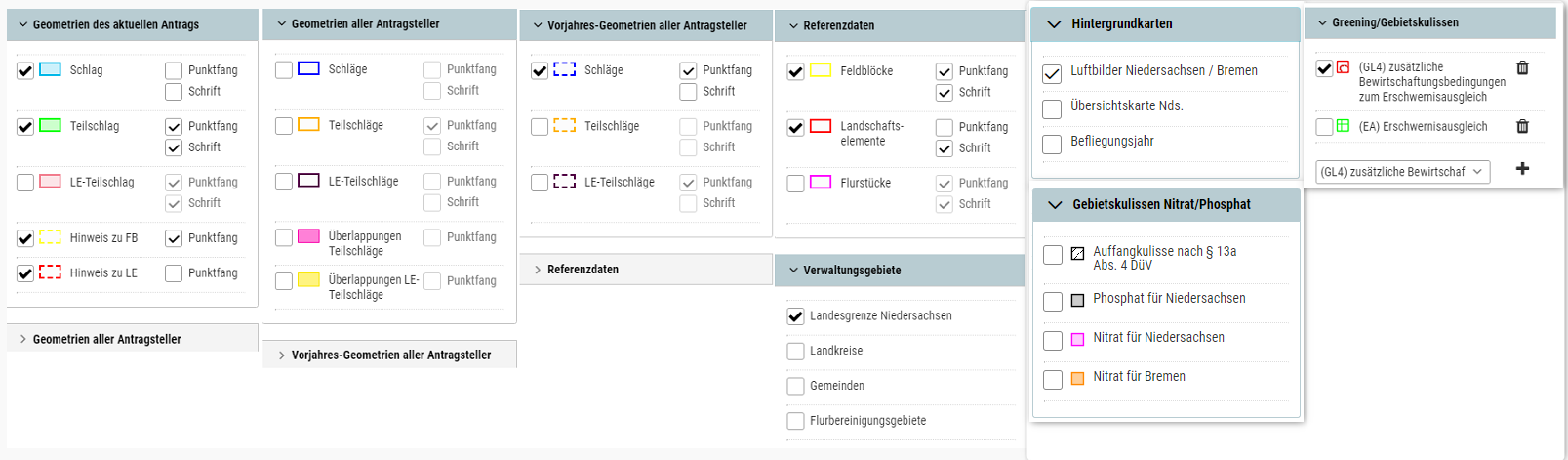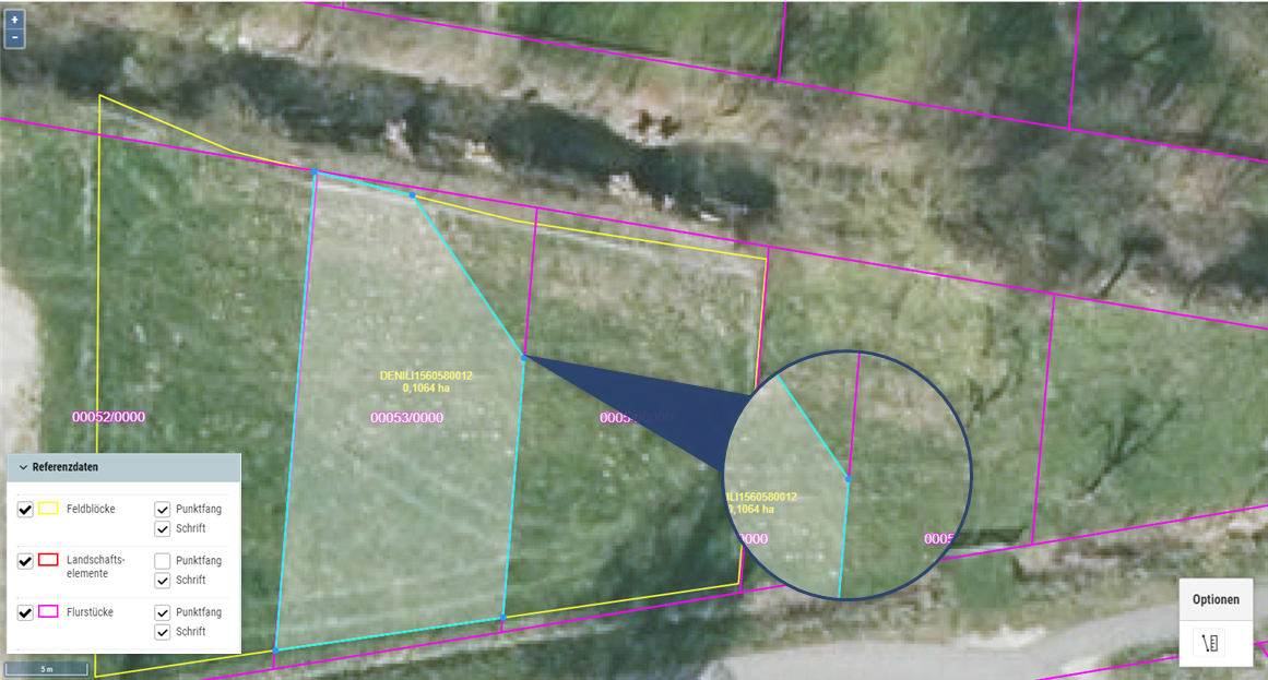 Informationen zu den Feldblöcken, Landschaftselementen und die Flurstückangaben finden Sie unter dem ausklappbaren Element Referenzdaten. Der Punktfang und die Beschriftung kann individuell angesteuert werden