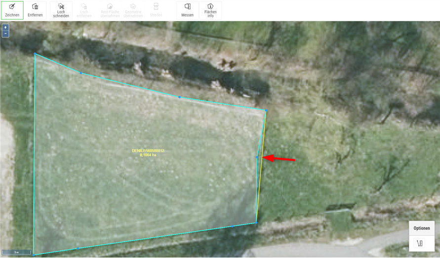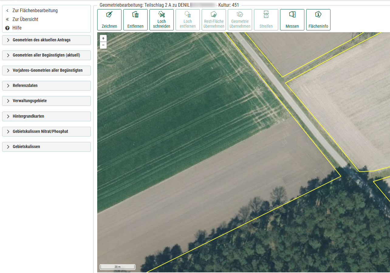 Durch Klicken auf die Schaltfläche "Geometriebearbeitung" unterhalb des Vorschau-Bildes gelangen Sie direkt in den Geometrie-Editor. Wichtig ist zudem, dass die exakte Lage des Schlages eingezeichnet wird und nicht über die tatsächliche Schlaggrenze hinweg markiert werden soll.