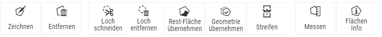 In der Geometriebearbeitung stehen die Werkzeuge Zeichnen, Entfernen, Loch schneiden, Loch entfernen, Rest-Fläche übernehmen, Geometrie übernehmen, Streifen, Messen und Flächeninfo zur Verfügung. Die Werkzeuge sind je nach Bearbeitungsstand aktiv bzw. wählbar.