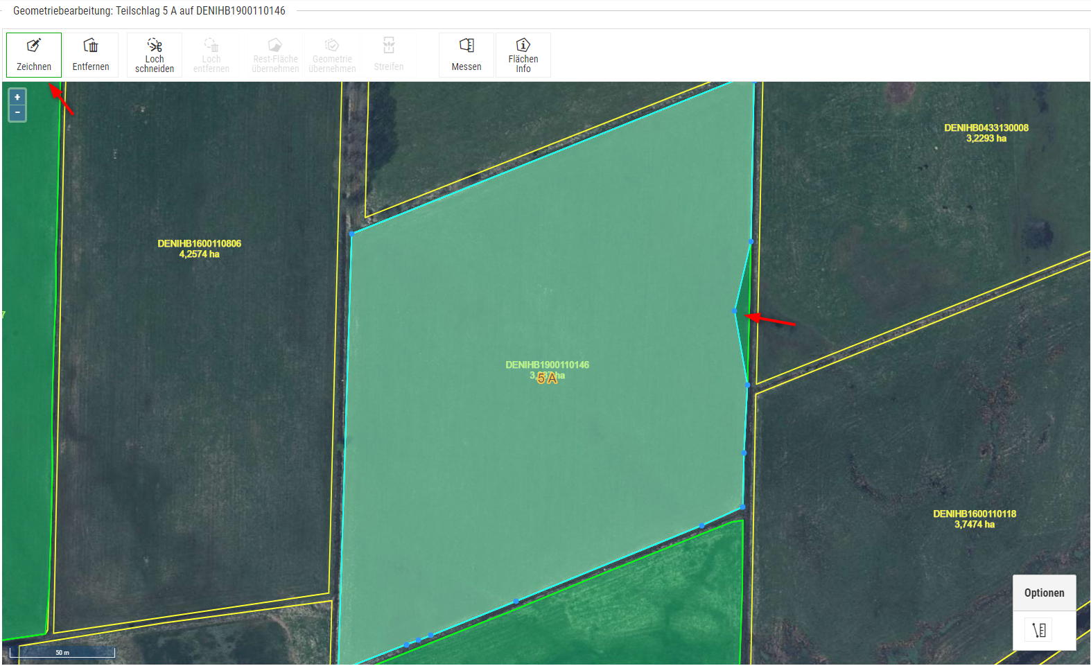 Falls Sie nur einen Teilbereich im Feldblock bewirtschaften muss die Geometrie des neuen Schlages gezeichnet werden. Klicken Sie auf die Schaltfläche "Geometriebearbeitung" und erstellen Sie eine Geometrie mit den verschiedenen Werkzeugen.