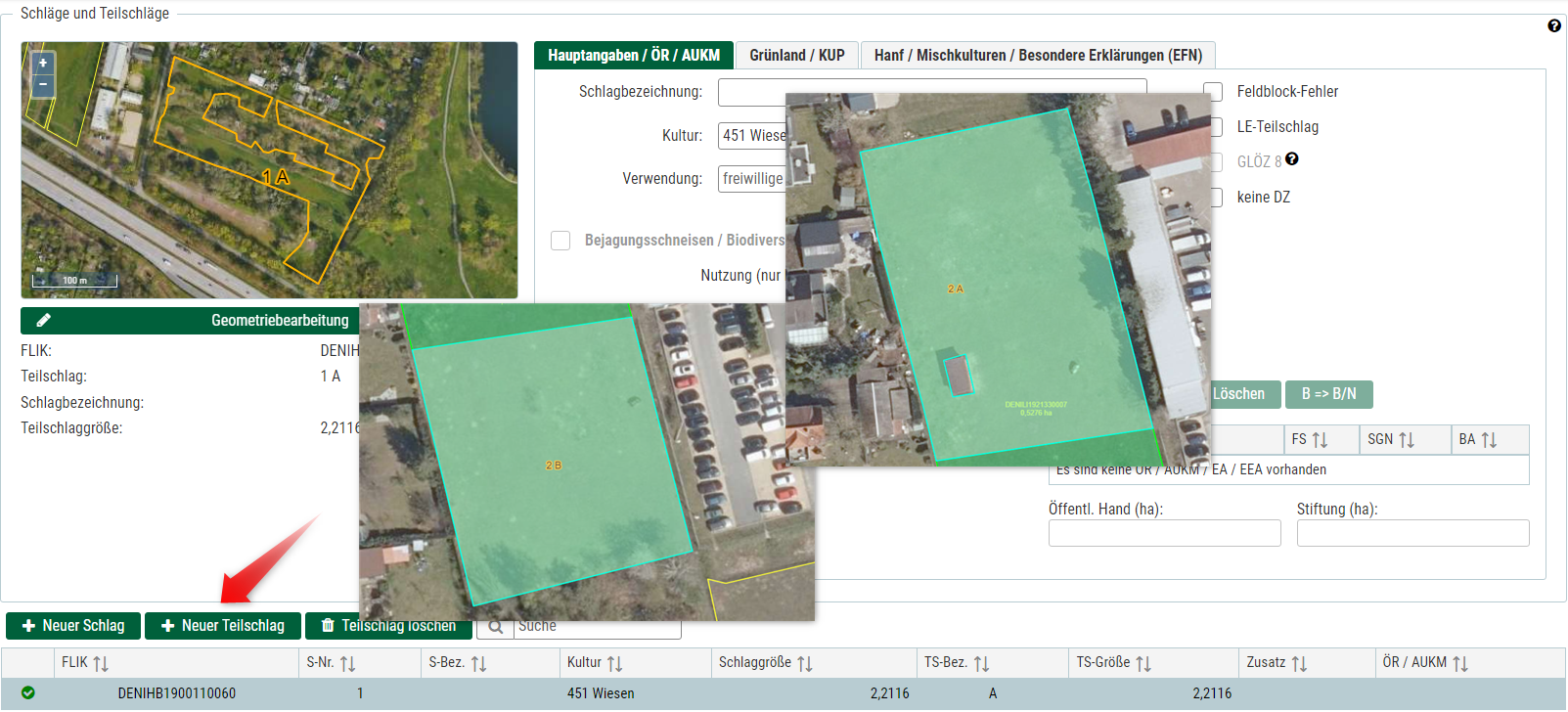 Wenn Sie einen Schlag mit unterschiedlichen Bewirtschaftungsattributen bewirtschaften, (wie zum Beispiel Ökoregelungen und einer AUKM) müssen Sie Teilschläge A und B angelegen. Durch Klick auf die Schaltfläche "Neuer Teilschlag" wird der Teilschlag B gespeichert und eine neue Zeile in der Flächentabelle angelegt. In der Eingabe im Register "Hauptangaben / ÖR / AUKM können Sie nun alle erforderlichen Angaben vornehmen. Wählen Sie nun in der Flächentabelle den Teilschlag A aus und klicken auf die Schaltfläche "Geometriebearbeitung" damit die Teilschlaggeometrie angelegt werden kann.