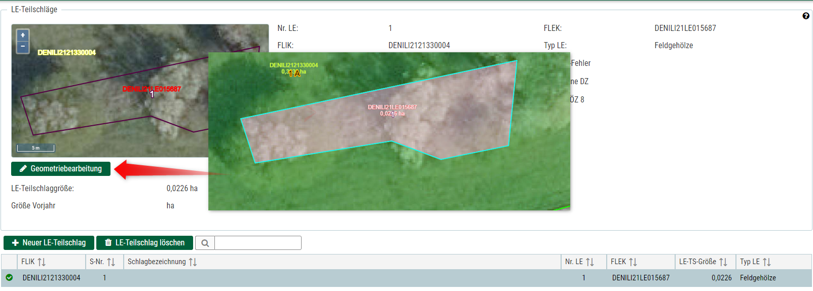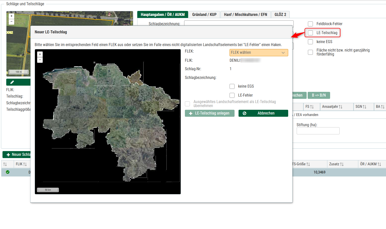 Um einen neuen LE-Teilschlag anzulegen, haken Sie das Ankreuzfeld "LE Teilschlag" am Schlag an und rufen Sei die Seite "LE-Teilschlag" auf. Dort können Sie oberhalb der Flächentabelle auf die Schaltfläche "Neuer LE-Teilschlag" klicken, wenn sich schon ein LE-Teilschlag am Schlag befindet. In dem sich öffnenden Fenster geben Sie bitte den FLEK an. Wenn sich noch kein Landschaftselement an dem Feldblock befindet, den Sie beantragen wollen, dann setzen Sie bei "LE Fehler" einen Haken, wählen keinen Fleck und bearbeiten auf der Seite "Landschaftselement-Fehler" das fehlende Landschaftselement. In der Geometriebearbeitung muss anschließend die Geometrie angepasst werden. Wenn sich mehrere Landschaftselemente am Schlag/Teilschlag befinden, können Sie über die Schaltfläche "Neuer LE-Teilschlag" weitere Landschaftselemente hinzufügen. Die LE-Teilschläge sind anschließend über die Schaltfläche "Geometriebearbeitung" mit den Werkzeugen zur Geometriebearbeitung anzulegen bzw. gegebenenfalls zu korrigieren.