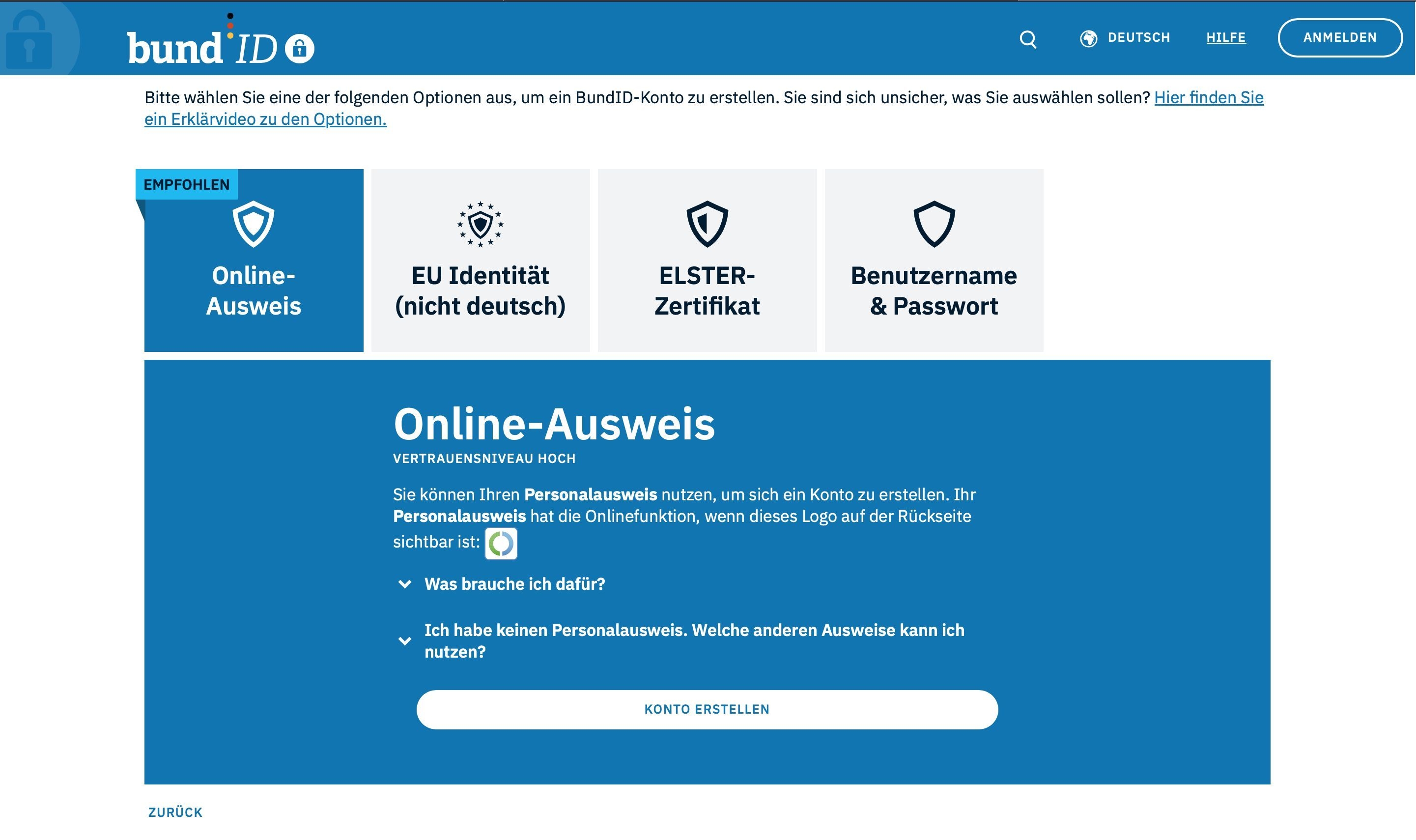 Bei der Erstellung eines BundID-Benutzerkontos gibt es mehrere Möglichkeiten sich zu registrieren. Verwenden Sie für die Abgabe in ANDI nur den Online-Ausweis, eine andere Variante kann für die Abgabe nicht verwendet werden.
