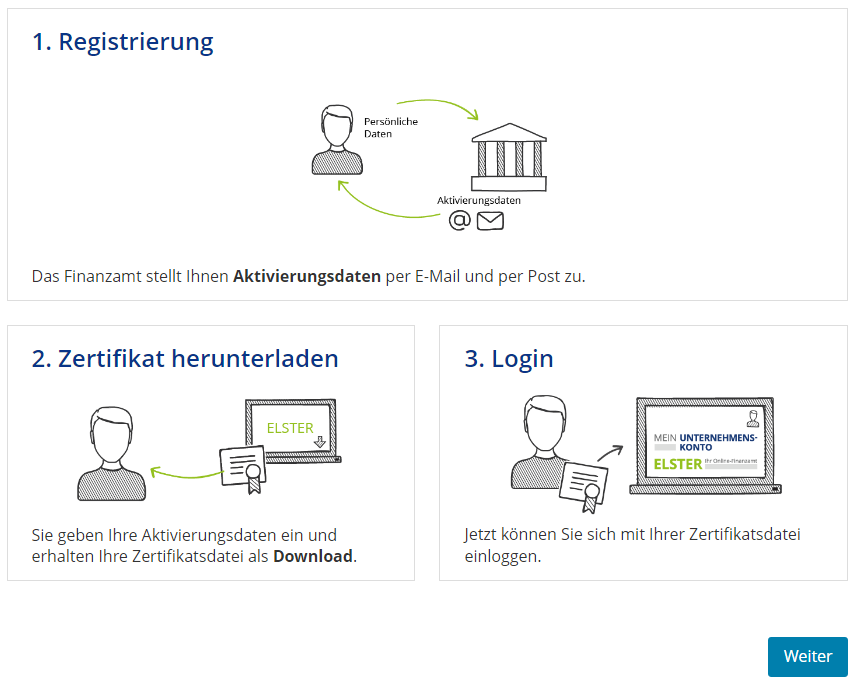 Sollten Sie lieber mit den ELSTER-Zertifikaten arbeiten wollen, können Sie Ihren Betrieb bei ELSTER registrieren oder wenn Sie schon ein persönliches Zertifikat mit Kennwort besitzen, dieses für die Abgabe verwenden.