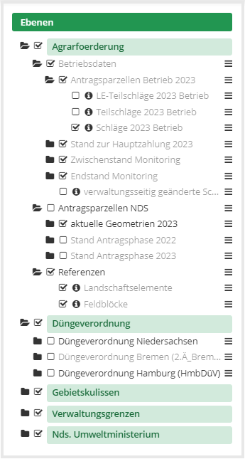 Die Darstellung der Antragsdaten erfolgt dabei in zwei Kategorien: Betriebsdaten (für den angemeldeten Betrieb) und Antragsparzellen (für ganz Niedersachsen). Diese Kategorien finden sich in den folgenden Ebenengruppen: